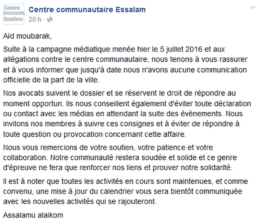 Sur son site web, le centre communautaire Essalam, situé dans un centre commercial, disait plutôt être un «lieu d'échange, de rencontres et de socialisation».