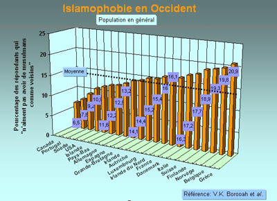 Deux sondages sur la perception occidentale des musulmans vivant en Occident ont été récemment publiés. Le premier, réalisé au printemps 2008 dans le cadre du Pew Global Attitudes Project [12], révèle toujours un indéniable accroissement de l’hostilité envers cette communauté dans de nombreux pays occidentaux. Le second, le plus récent, communiqué par le GMF (German Marshall Fund of the United States) en novembre 2008, confirme cette tendance [13]. Cette étude réalisée aux USA et dans sept pays européens montre clairement, qu’en moyenne, environ 1 occidental sur 2 ne pense pas « que les modes de vie occidentaux et musulmans sont conciliables » et ne croit pas que « les musulmans ont beaucoup à offrir à la culture du pays d'accueil ».
