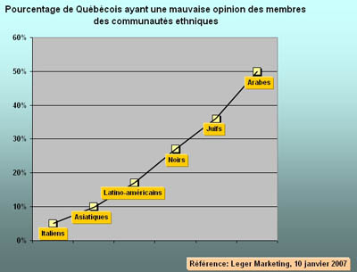 La "grande enquête sur la tolérance au Québec" de la firme Léger Marketing [11] qui a fait couler beaucoup d’encre en 2007, a montré qu’un Québécois sur 2 avait une mauvaise opinion sur les Arabes (fig.7). Comme la plupart des Occidentaux ne font pas nécessairement la différence entre la notion d’Arabe et celle de musulman, les deux mots peuvent être considérés comme interchangeables dans le sondage.