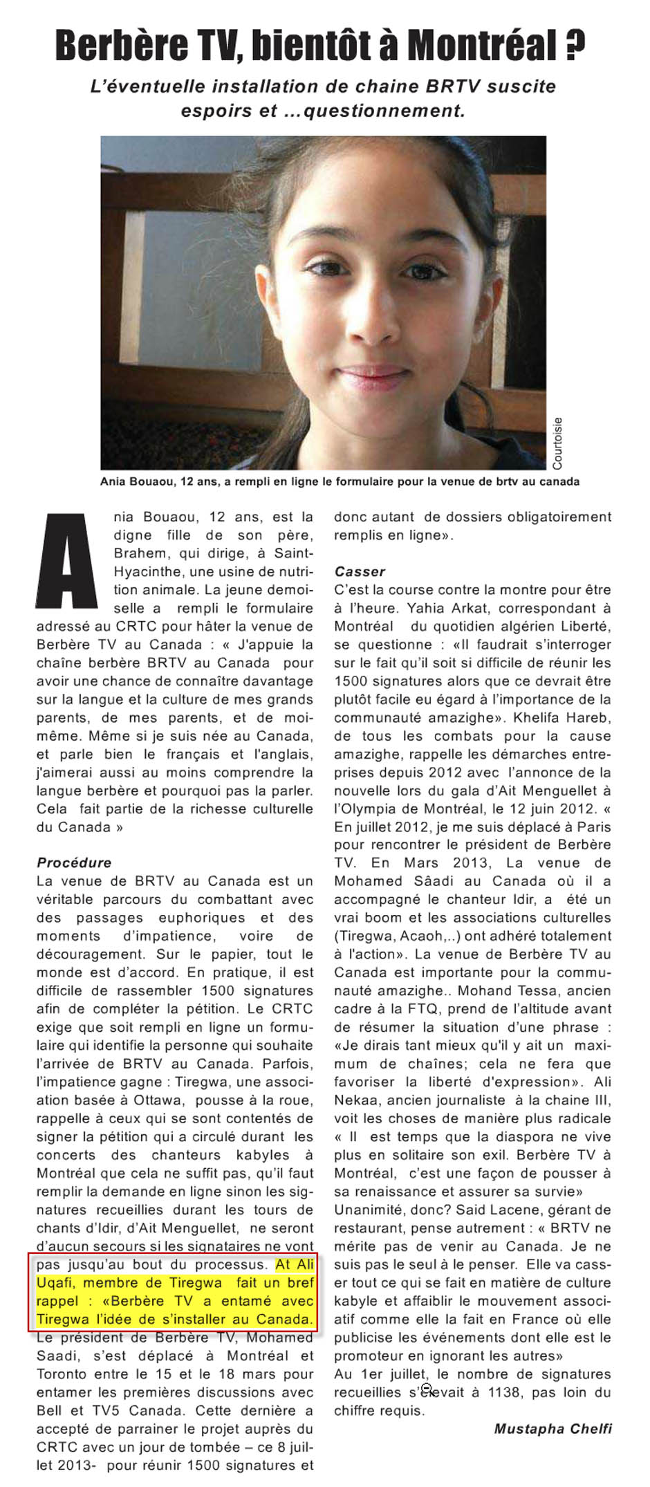 Je tiens à préciser aux lecteurs du journal « Alfa » que l’idée de l’entrée de la BRTV au Canada a été initiée par des travailleurs amazighophones d'une des plus principales compagnies de télécommunications ici au canada. Elle n’est en aucun cas l’idée d’une quelconque association ou fondation, même si ces dernières ont contribué fortement à l’action. Je porte à votre connaissance que ces travailleurs ont déjà prouvé, par le passé, leur courage et leur attachement à Tamazight car ils ont réussi à intégrer Tamazight sur le site Intranet de leur l'entreprise. Grâce à eux, « Bienvenue » est transcrit dans la langue Tamazight « Ansuf yeswen ».