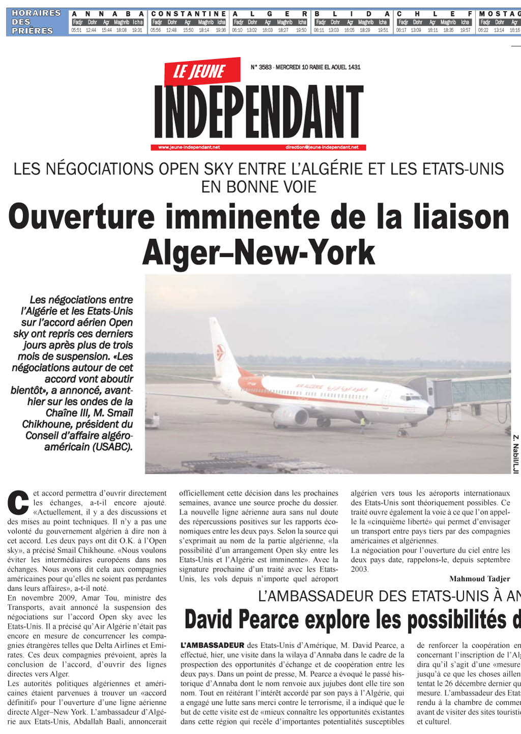 En novembre 2009, Amar Tou, ministre des Transports, avait annoncé la suspension des négociations sur l’accord Open sky avec les Etats-Unis. Il a précisé qu’Air Algérie n’était pas encore en mesure de concurrencer les compagnies étrangères telles que Delta Airlines et Emirates. Ces deux compagnies prévoient, après la conclusion de l’accord, d’ouvrir des lignes directes vers Alger.